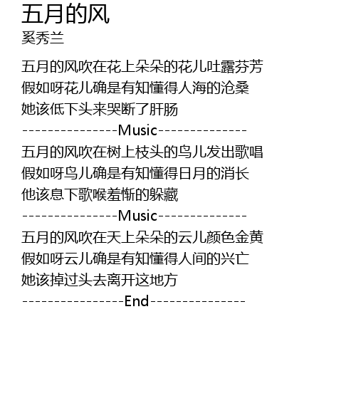 | [01:06.97] | 五月的风吹在树上枝头的鸟儿发出歌唱 |