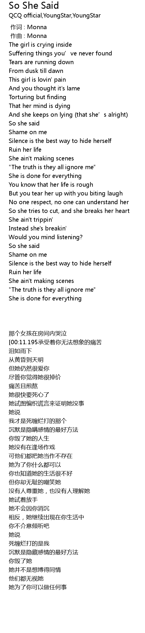 | [00:06.257] | The girl is crying inside |
