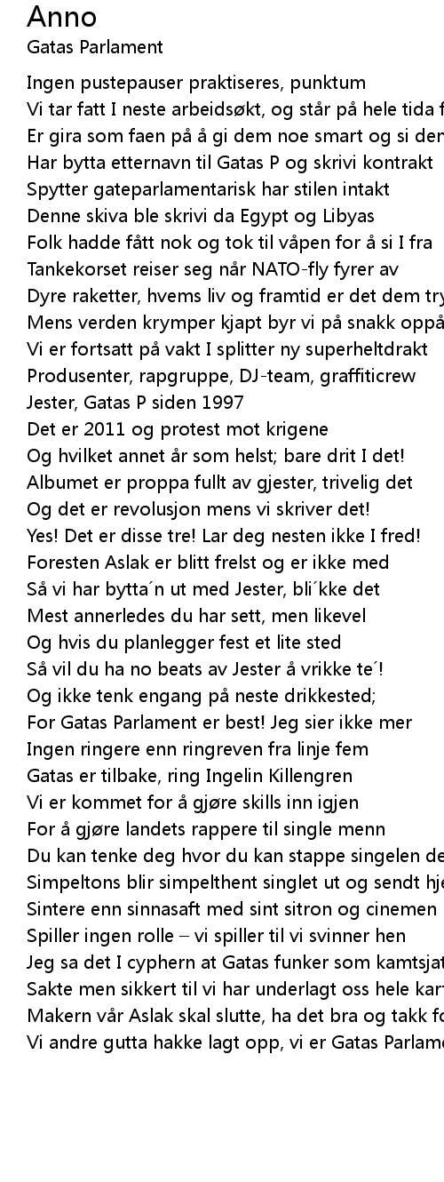 | [01:56.22] | Vi andre gutta hakke lagt opp, vi er Gatas Parlament |