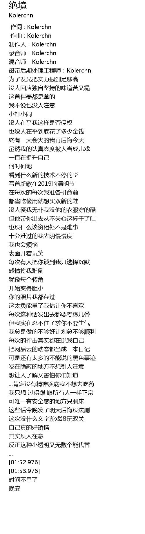 | [00:09.264] | 母带后期处理工程师:Kolerchn |