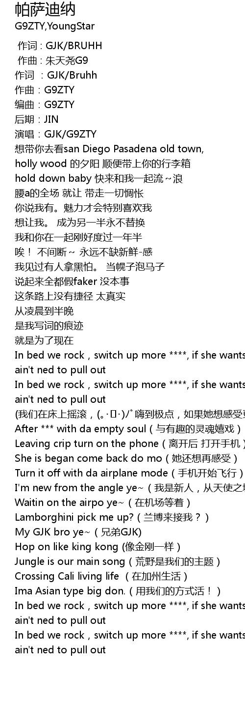 | [01:02.413] | In bed we rock,switch up more ****, if she wants to feel it we ain't ned to pull out |