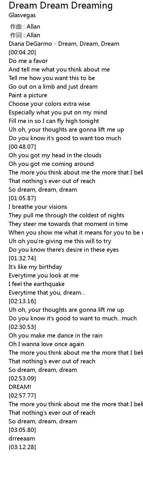 | [00:00.57] | Diana DeGarmo - Dream, Dream, Dream |