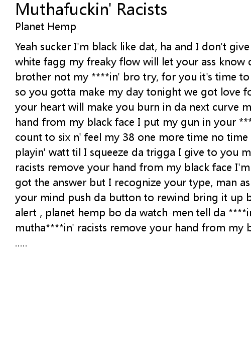 Yeah sucker I'm black like dat, ha and I don't give a **** if you're a ****in' white fagg my freaky flow will let your ass know dat you're not my ****in' brother not my ****in' bro try, for you it's time to die not goin' out like dat so you gotta make my day tonight we got love for whom deserves but da hate in your heart will make you burn in da next curve mutha****in' racists remove your hand from my black face I put my gun in your ****in' face mutha****in' racists count to six n' feel my 38 one more time no time to waste but if you think I'm playin' watt til I squeeze da trigga I give to you my boom bye bye mutha****in' racists remove your hand from my black face I'm not a black panther and I don't got the answer but I recognize your type, man as da free world cancer xtra-large your mind push da button to rewind bring it up bring it back come, rewind red alert , planet hemp bo da watch-men tell da ****in' racists we're ready to dem mutha****in' racists remove your hand from my black face burn burn baby burn ..... |