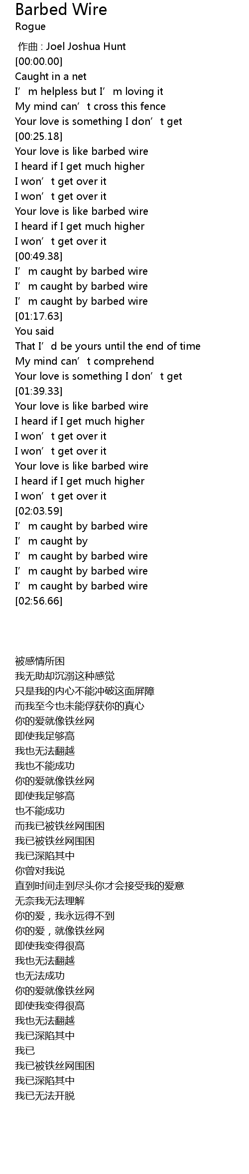 | [01:41.89] | Your love is like barbed wire |
