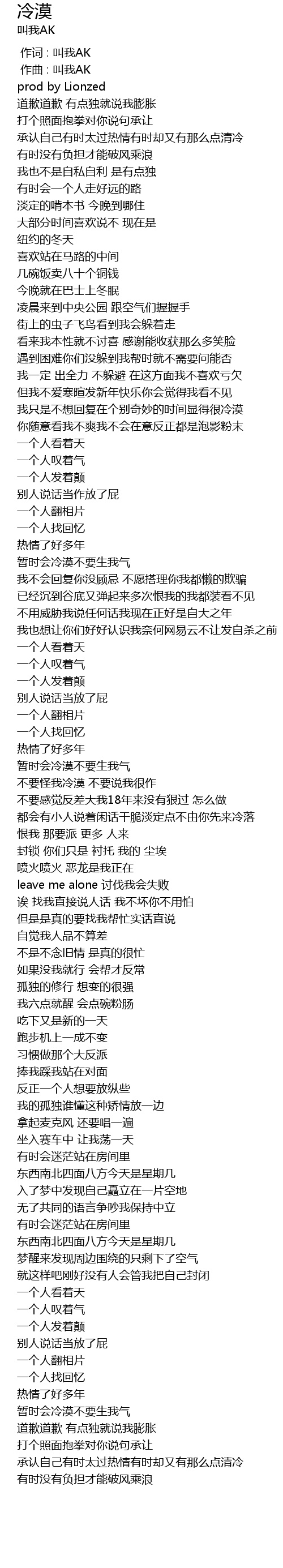 | [01:17.654] | 我不会回复你没顾忌 不愿搭理你我都懒的欺骗 |
