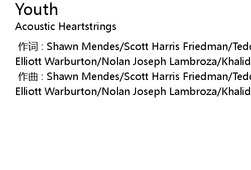 | [00:00.000] | zuò qǔ : Shawn Mendes Scott Harris Friedman Teddy Geiger Geoffrey Elliott Warburton Nolan Joseph Lambroza Khalid Donnel Robinson |