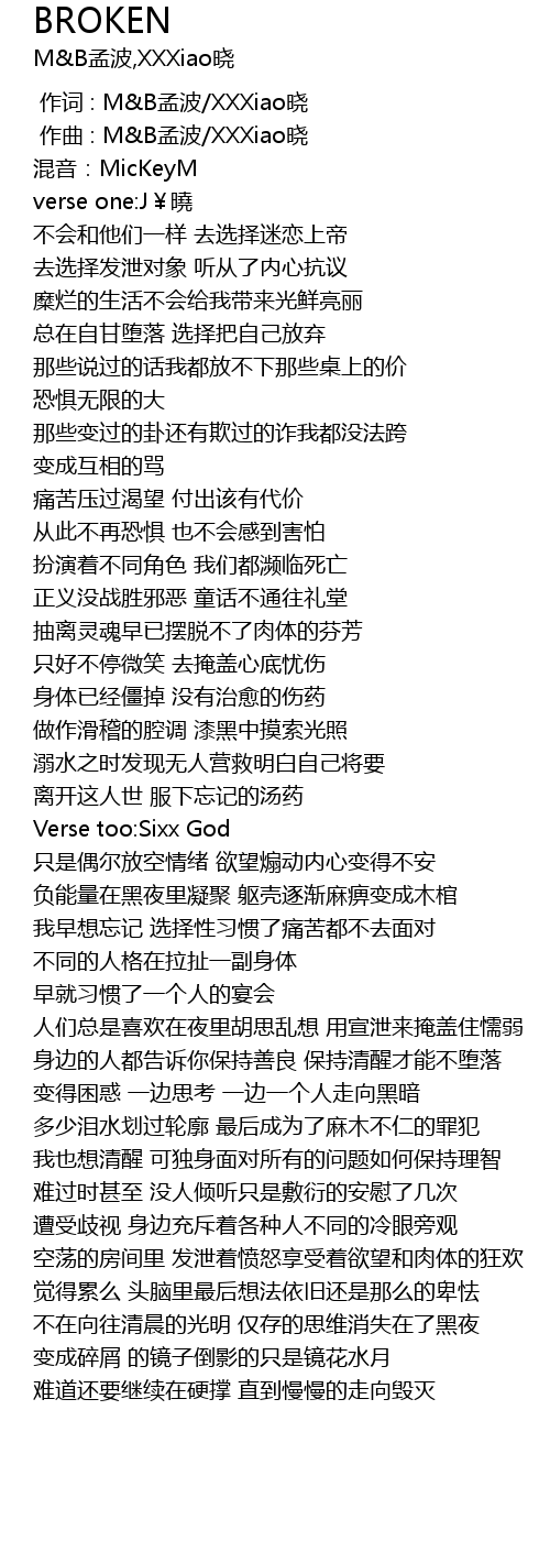 | [00:00.000] | 作词 : M&B孟波/XXXiao晓 |