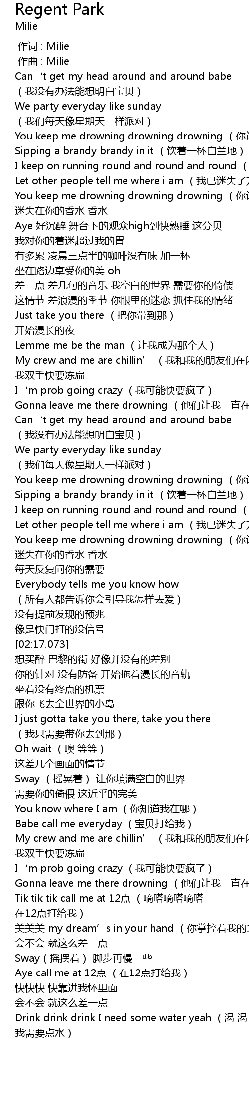 | [00:17.182] | Can' t get my head around and around babe wǒ méi yǒu bàn fǎ néng xiǎng míng bái bǎo bèi |
