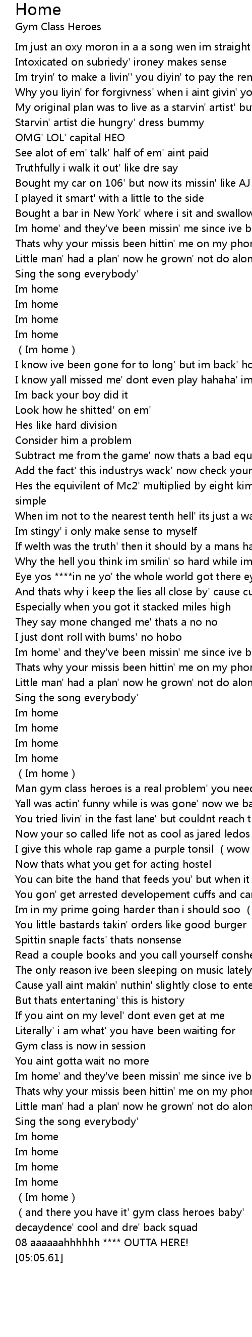 | [04:32.17] | Im home' and they've been missin' me since ive been gone |