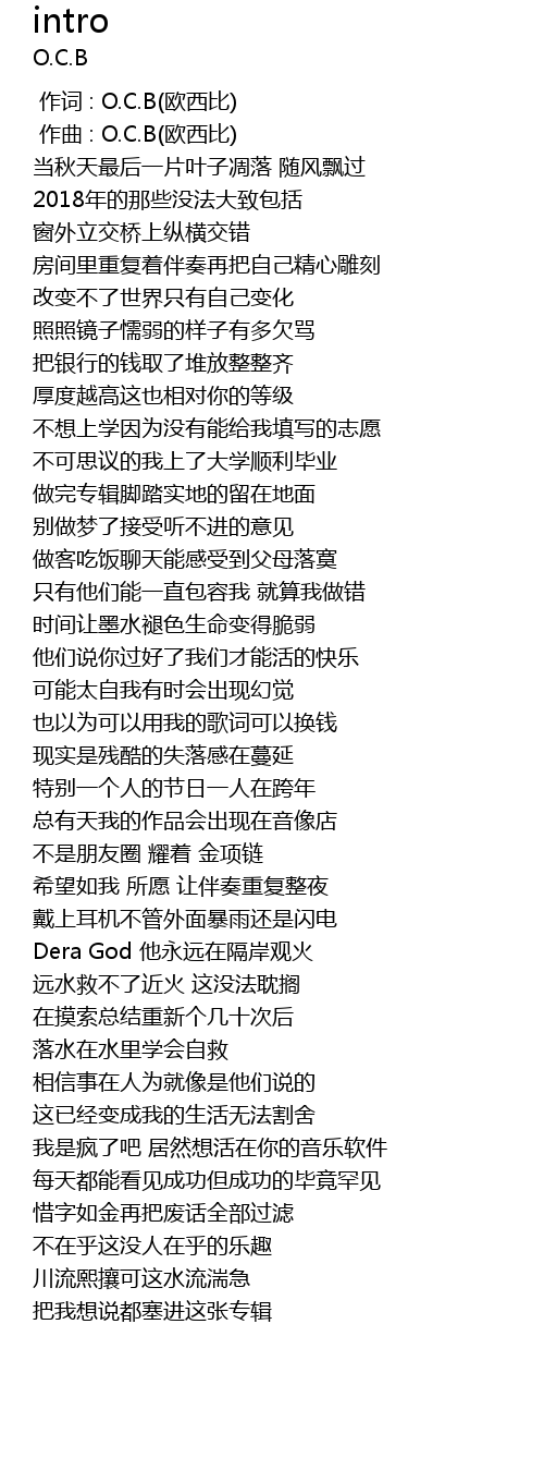 | [00:00.000] | 作词 : O.C.B(欧西比) |