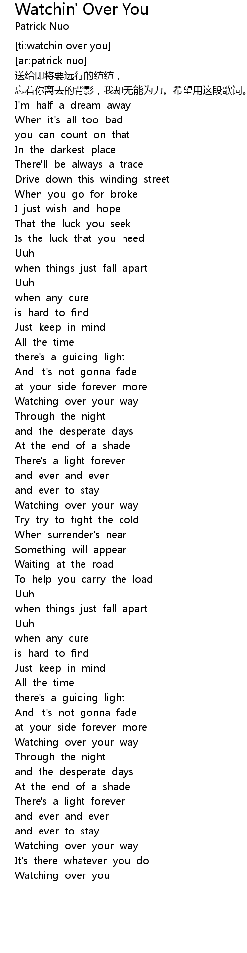 | [00:04.704] | wàng zhe nǐ lí qù de bèi yǐng, wǒ què wú néng wéi lì. xī wàng yòng zhè duàn gē cí. jì tuō wǒ men bǐ cǐ de sī niàn, yǒu yuán zài xiāng jiàn! bīng táng fǎng |