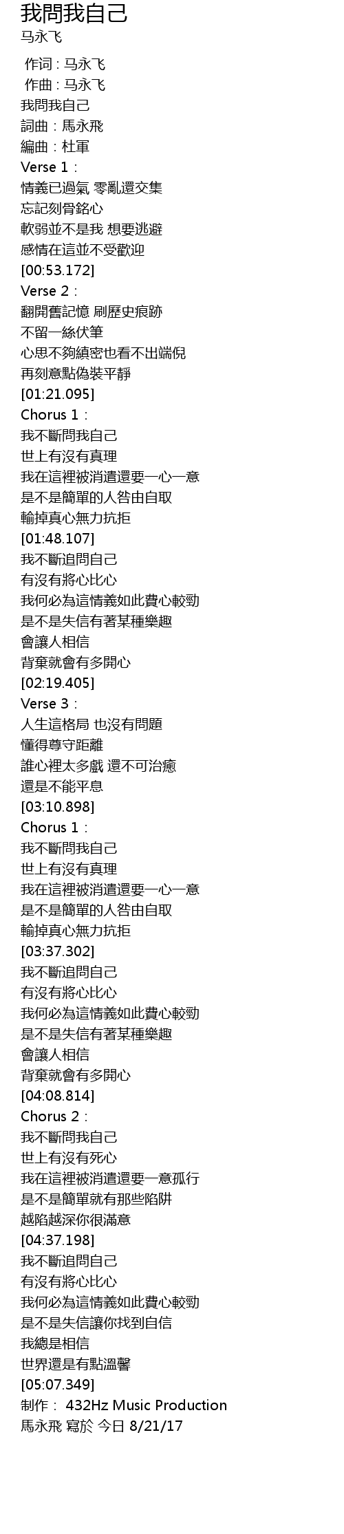 | [00:00.000] | wǒ wèn wǒ zì jǐ |