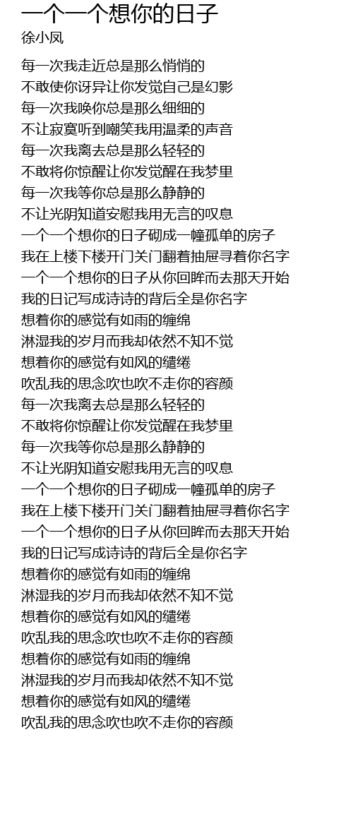 | [01:38.530] | yí gè yí gè xiǎng nǐ de rì zi cóng nǐ huí móu ér qù nà tiān kāi shǐ |