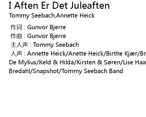 | [00:00.000] | 人声 : Annette Heick/Anette Heick/Birthe Kjær/Brdr. Olsen/Jørgen De Mylius/Keld & Hilda/Kirsten & Søren/Lise Haavik/Lucienne/Ole Bredahl/Snapshot/Tommy Seebach Band |