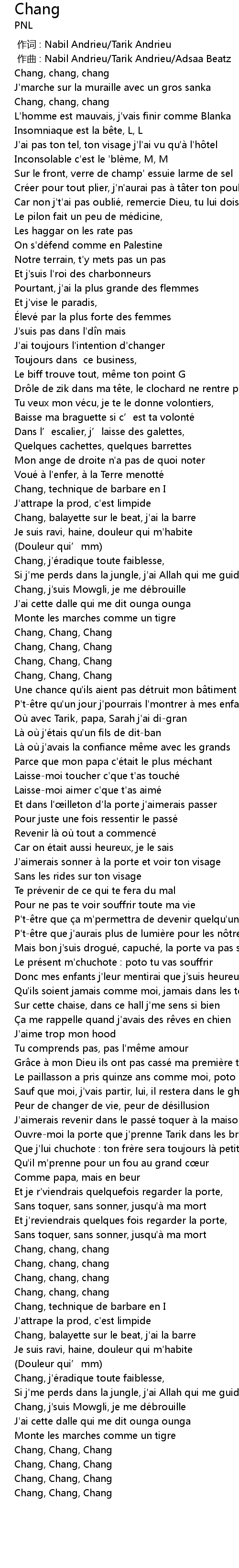 | [01:56.37] | Chang, j' suis Mowgli, je me de brouille |