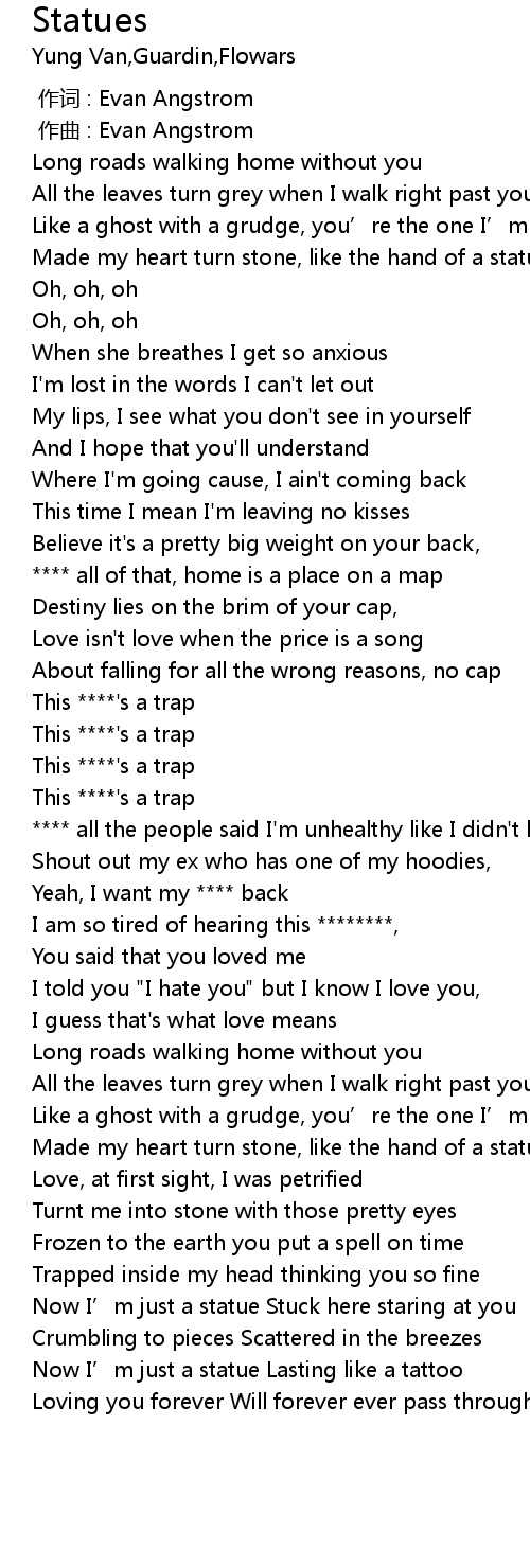 | [02:27.74] | Now I' m just a statue Stuck here staring at you |
