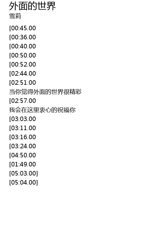 | [04:04.00][02:44.00][00:58.00] | 外面的世界很精彩 |