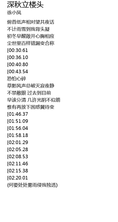 | [01:26.14][00:36.10] | 深秋立楼头 半泪盈 |