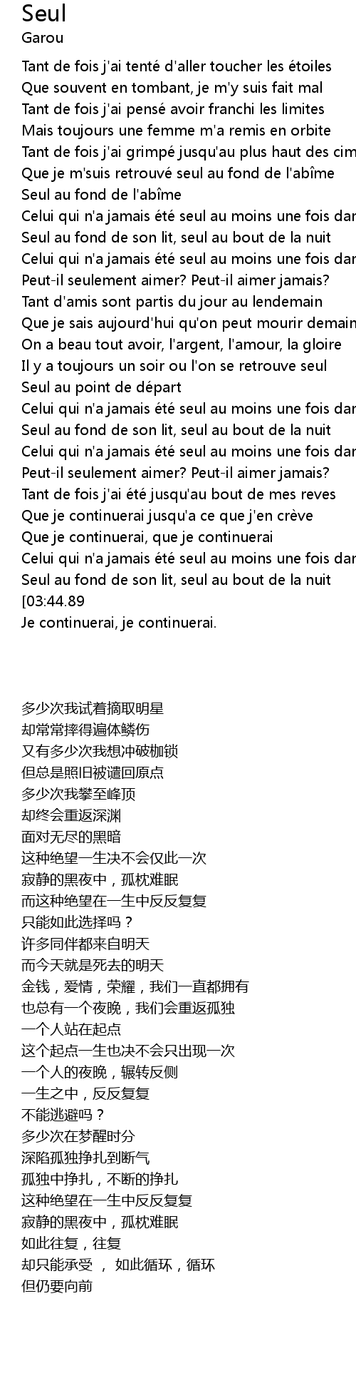 | [02:22.00] | Celui qui n' a jamais é té seul au moins une fois dans sa vie |