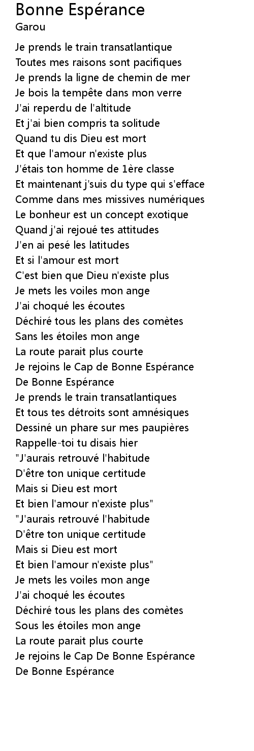 | Song | Bonne Espérance |