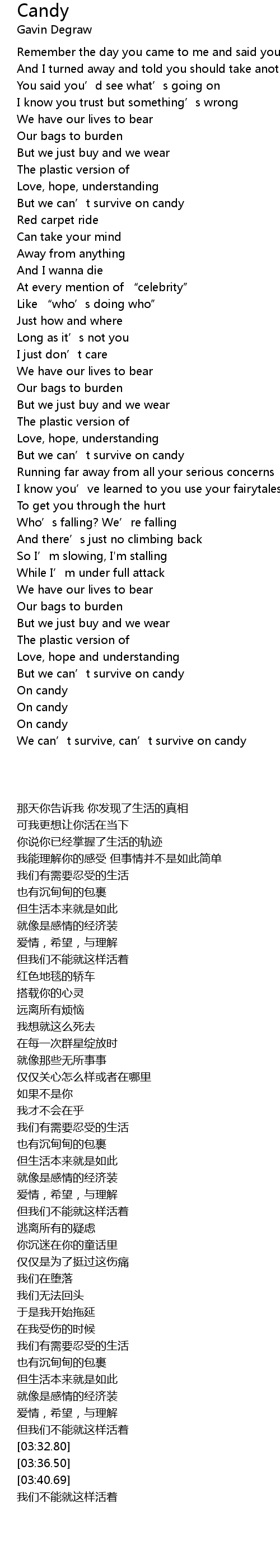 | [03:44.84] | We can' t survive, can' t survive on candy |