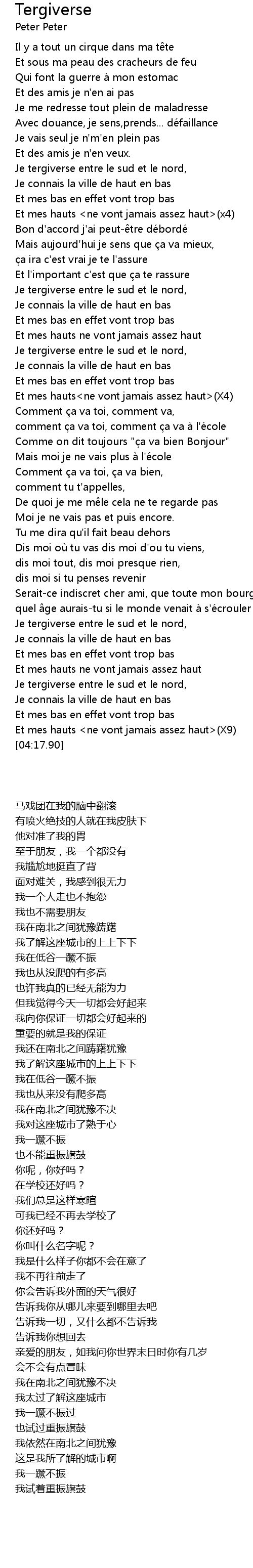 | [00:59.60] | Je tergiverse entre le sud et le nord, |