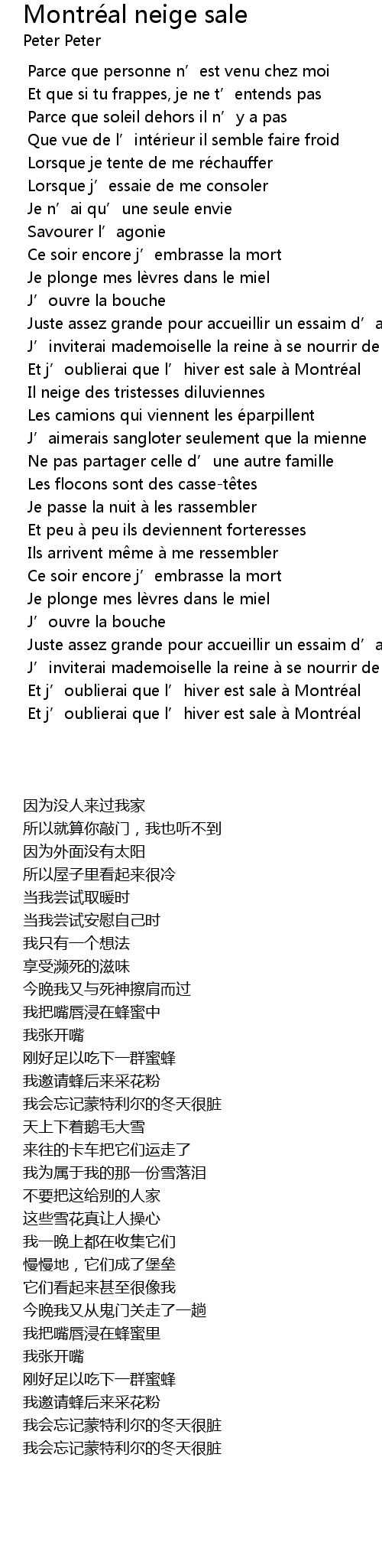 | [02:44.448] | Et j' oublierai que l' hiver est sale à Montré al |