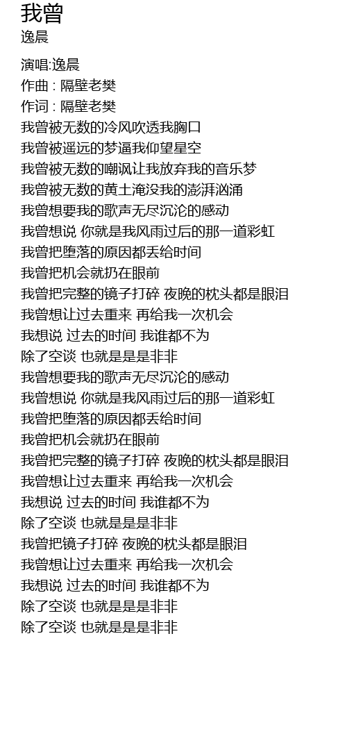 | [00:01.93] | 作词 : 隔壁老樊 |