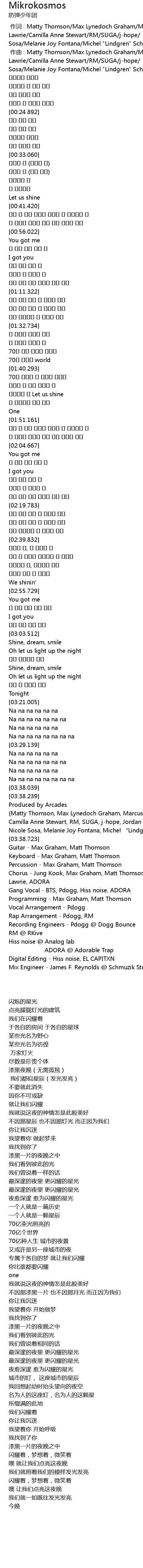 | [03:38.573] | (Matty Thomson, Max Lynedoch Graham, Marcus McCoan, Ryan Lawrie, Camilla Anne Stewart, RM, SUGA, j-hope, Jordan “DJ Swivel” Young, Candace Nicole Sosa, Melanie Joy Fontana, Michel “Lindgren” Schulz) |
