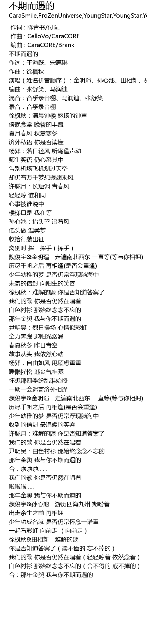 | [00:14.347] | 演唱(姓名拼音顺序):金明瑄、孙心池、田相新、魏俊宇、徐枫秋、许胧月、杨羿、尹明昊 |