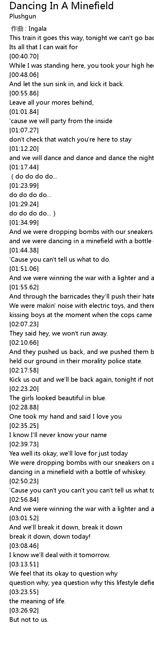 | [01:41.46] | and we were dancing in a minefield with a bottle of Whiskey. |