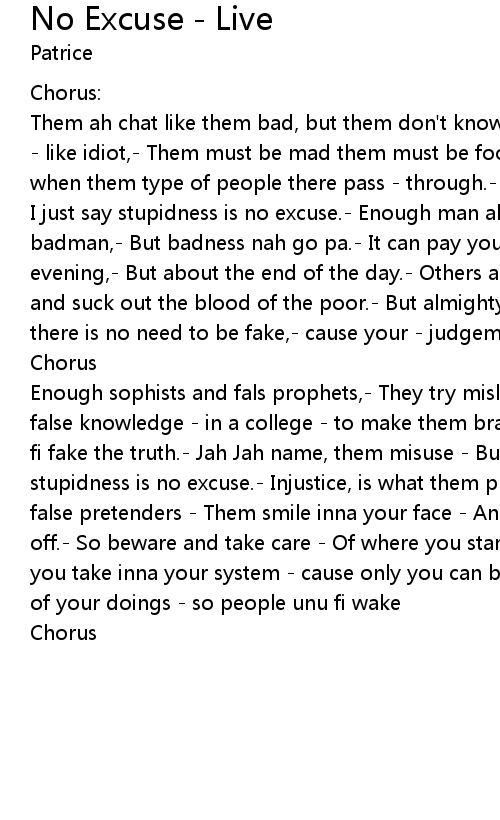 I just say stupidness is no excuse.- Enough man ah gawn like them are bad man?- badman,- But badness nah go pa.- It can pay yout rent in the morning and the evening,- But about the end of the day.- Others ah gawn like them are big man - and suck out the blood of the poor.- But almighty Jah Jah I see everything,- so there is no need to be fake,- cause your - judgement you can't escape.