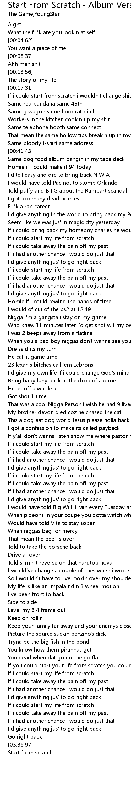 | [00:19.74] | If i could start from scratch i wouldn't change shit |