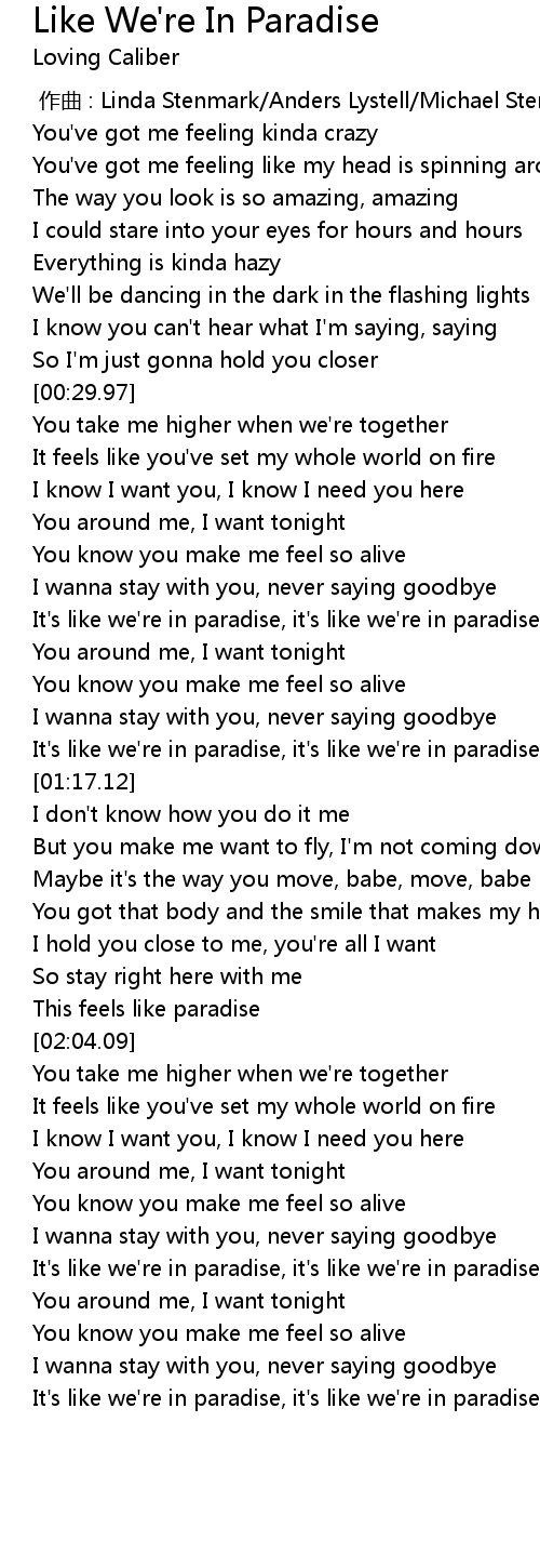 | [01:13.42] | It' s like we' re in paradise, it' s like we' re in paradise |