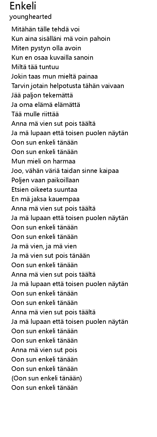 | [00:13.394] | Kun aina sis ll ni m voin pahoin |