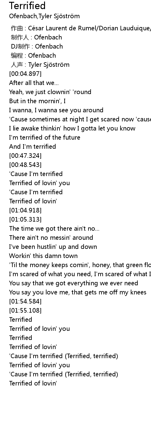 | [02:21.375] | ' Cause I' m terrified Terrified, terrified |