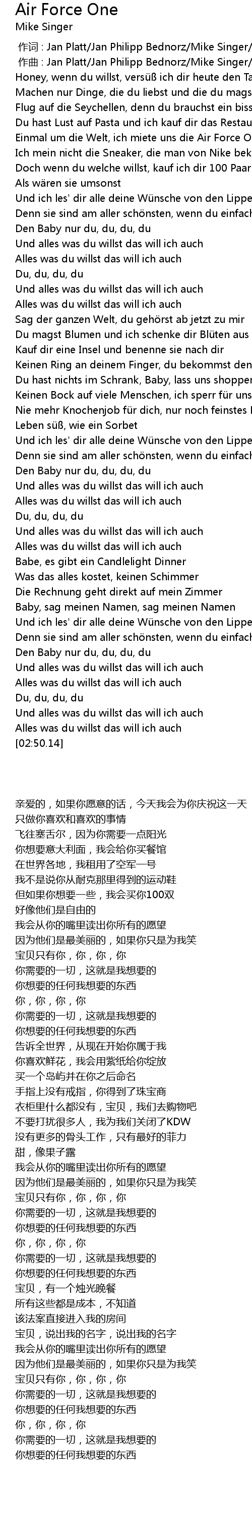 | [00:23.39] | Einmal um die Welt, ich miete uns die Air Force One |