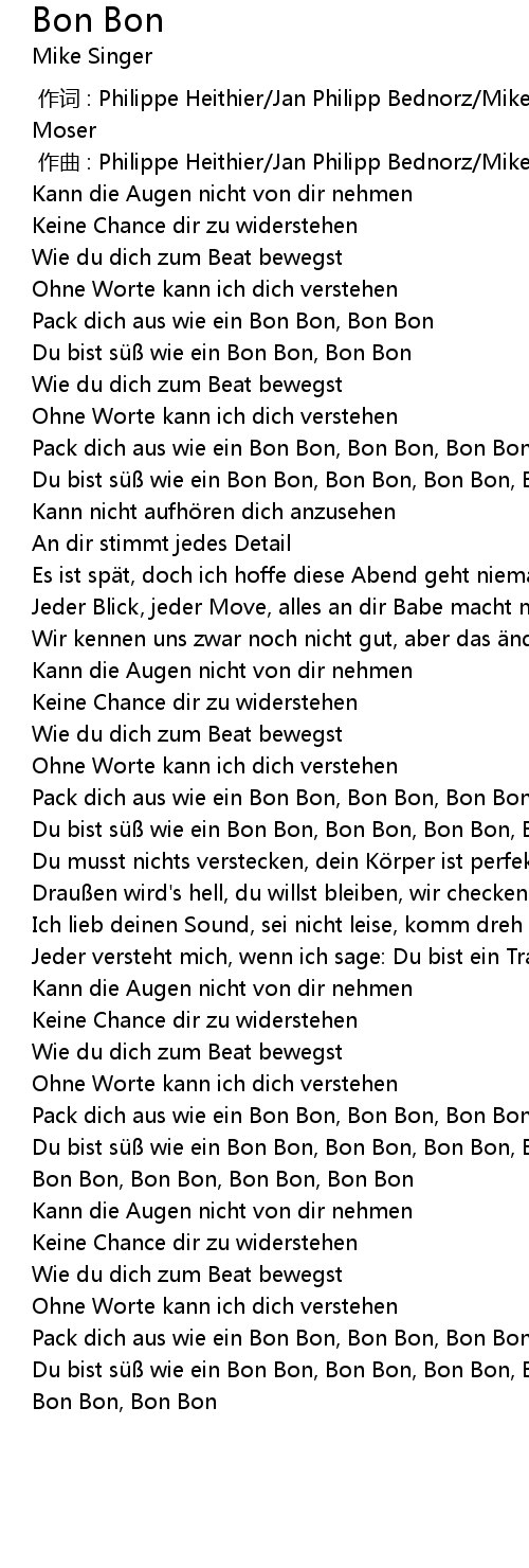| [02:21.47] | Du bist süß wie ein Bon Bon, Bon Bon, Bon Bon, Bon Bon |