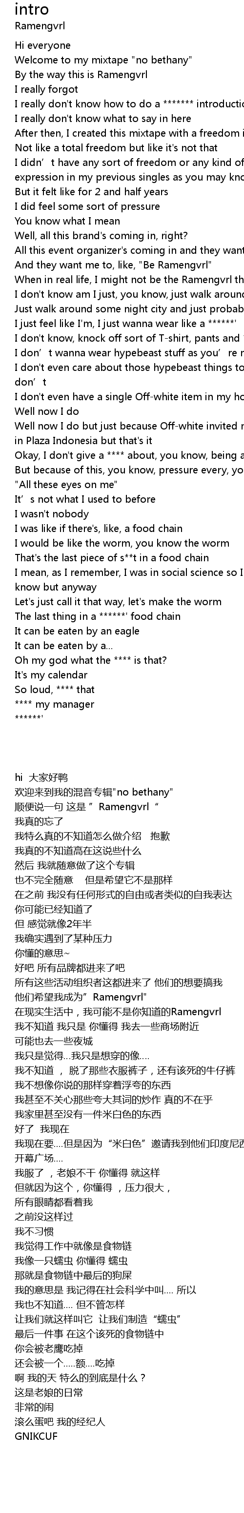 | [00:03.194] | Welcome to my mixtape "no bethany" |