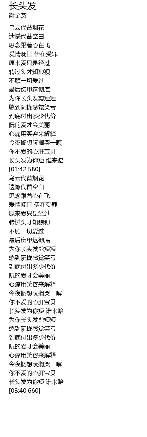 | [01:32.470] | cháng tóu fā wèi nǐ duǎn shuí lái péi |