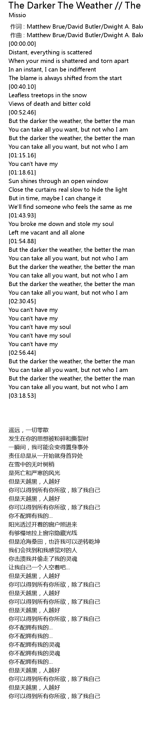 | [00:53.30] | But the darker the weather, the better the man |