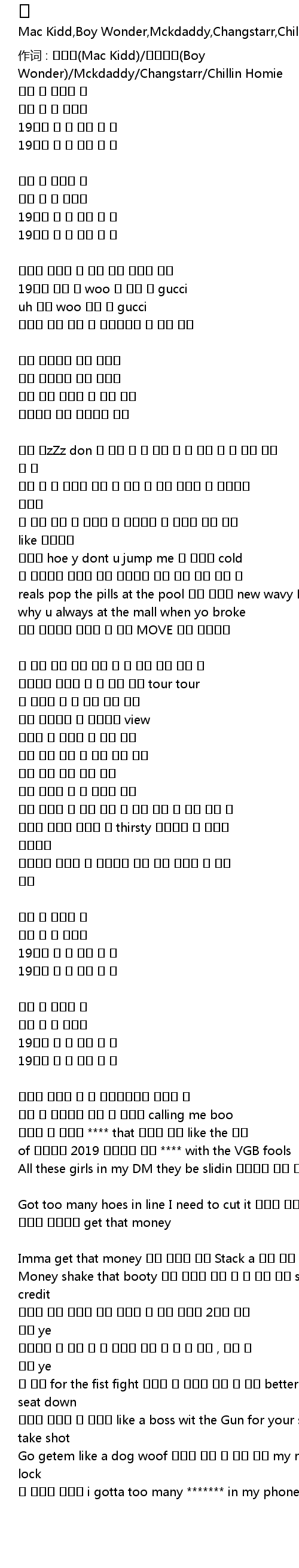 作词 : 맥키드(Mac Kidd)/보이원더(Boy Wonder)/Mckdaddy/Changstarr/Chillin Homie |