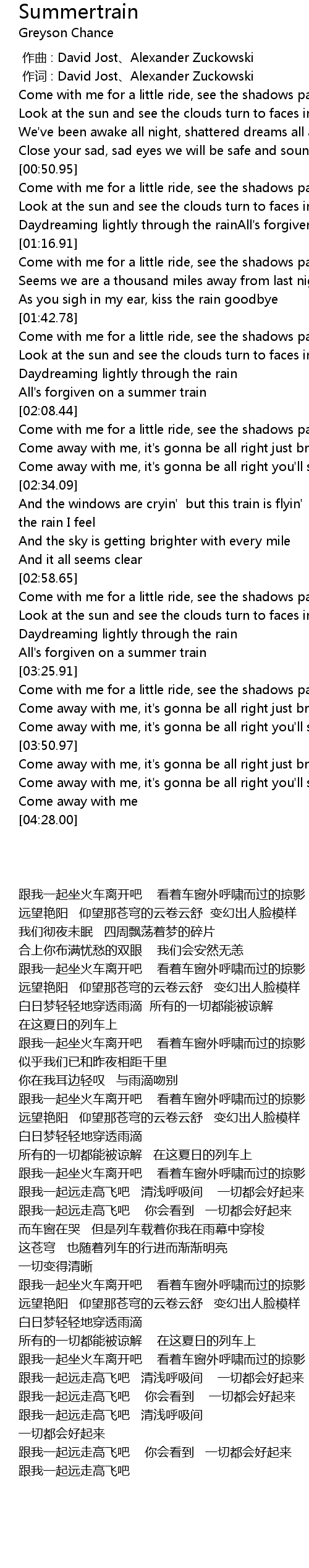 | [01:08.84] | Daydreaming lightly through the rainAll's forgiven on a summer train |