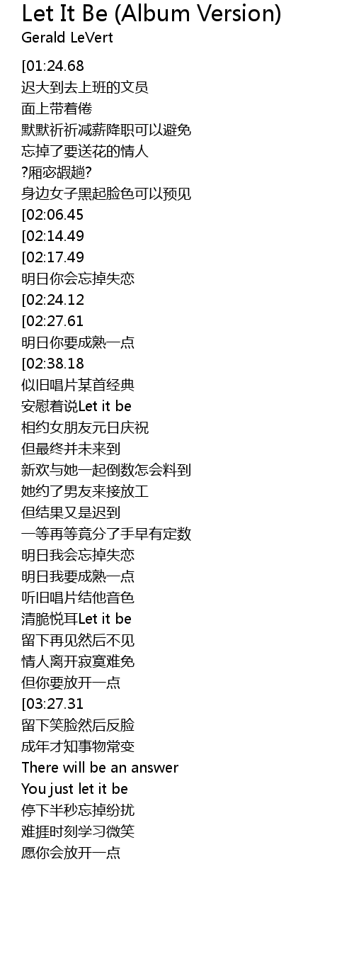 | [00:10.15][01:24.68][03:33.50] | 关智斌-Let It Be(粤) |