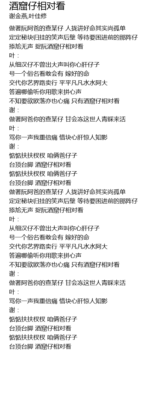 | [01:23.180] | 不知要欲欧落亦也心痛 只有酒窟仔相对看 |
