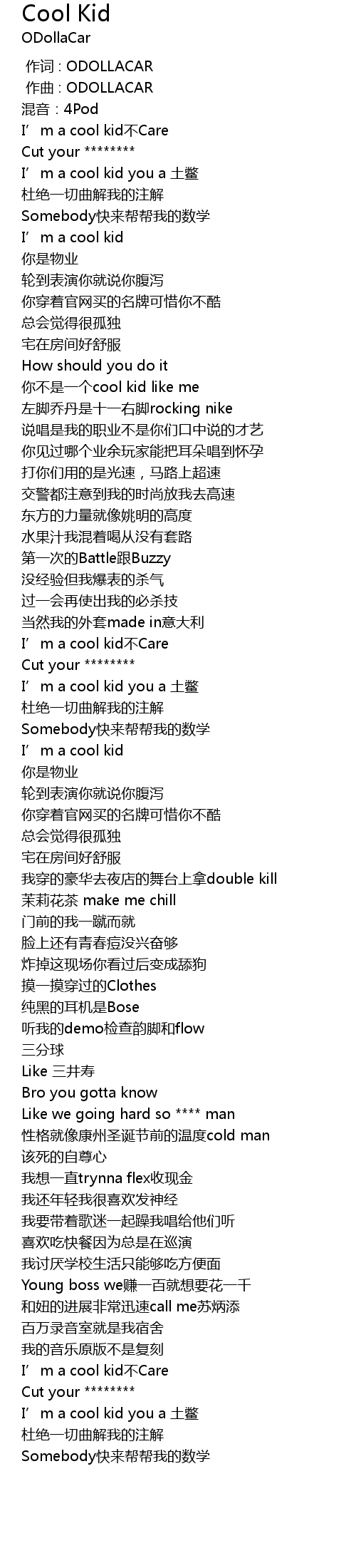 | [00:14.068] | I' m a cool kid you a tǔ biē |