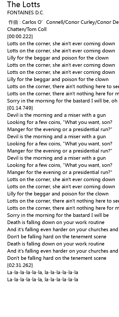 | [02:02.318] | Lotts on the corner, there ain't nothing here to see |
