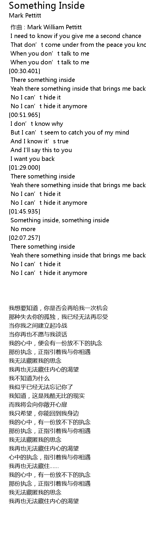 | [01:32.302] | Yeah there something inside that brings me back to you yeah |
