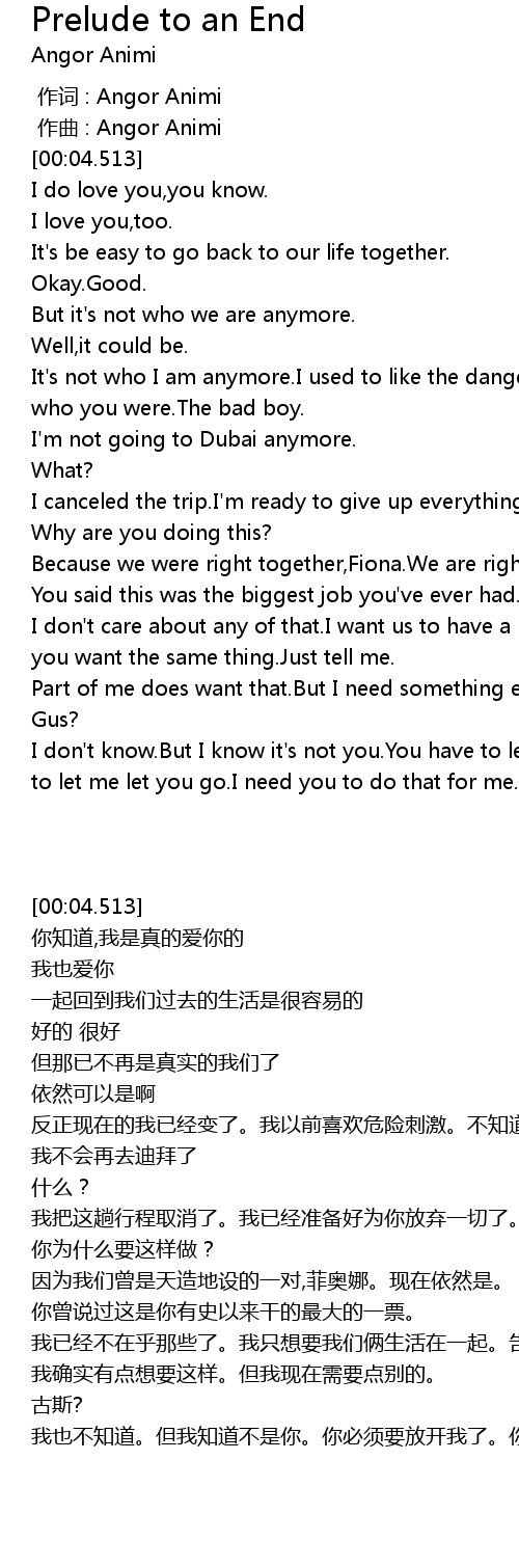| [01:38.687] | I don't know.But I know it's not you.You have to let me go.You have to let me let you go.I need you to do that for me. |