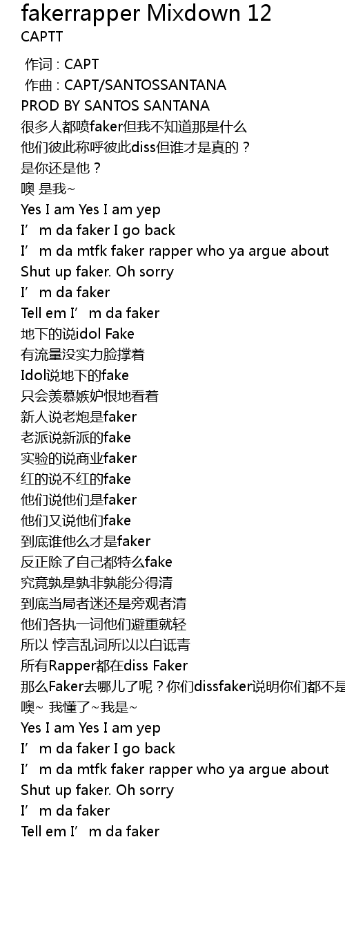 | [01:27.790] | 所有Rapper都在diss Faker 那么Faker去哪儿了呢?你们dissfaker说明你们都不是,那么谁才是Faker |